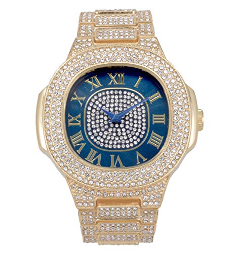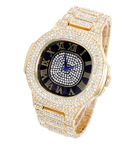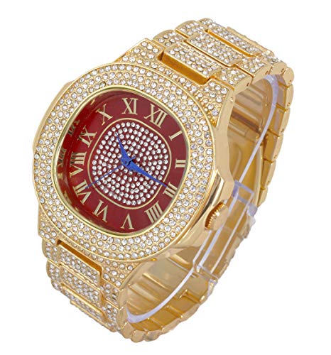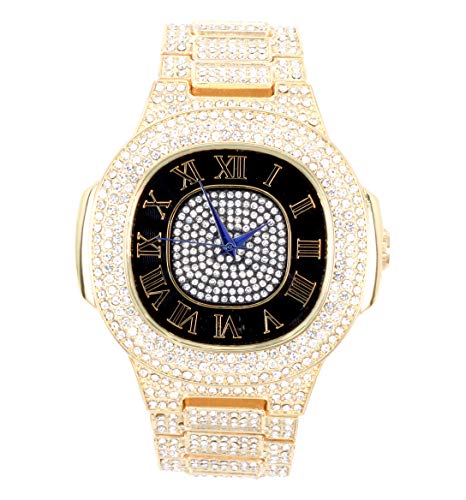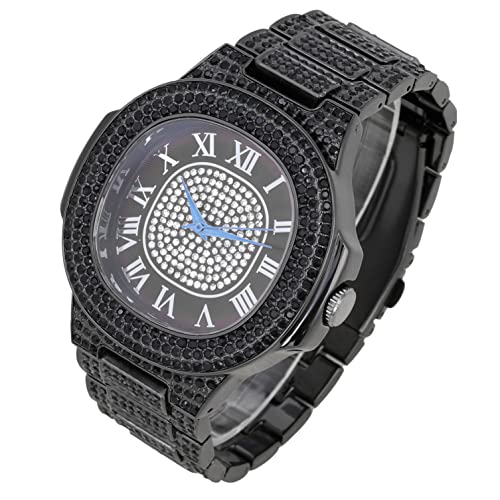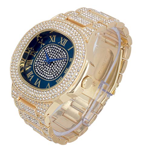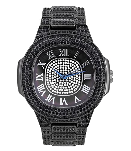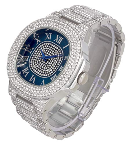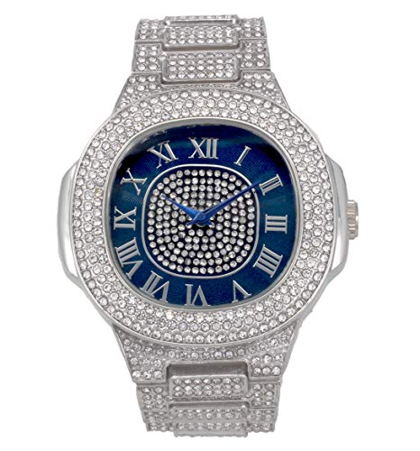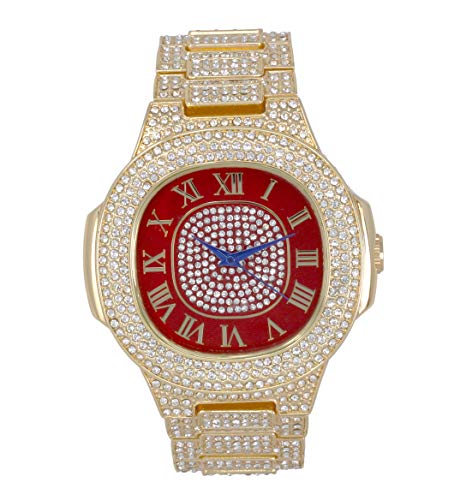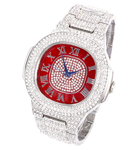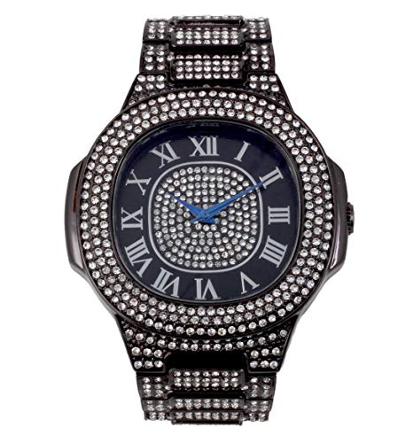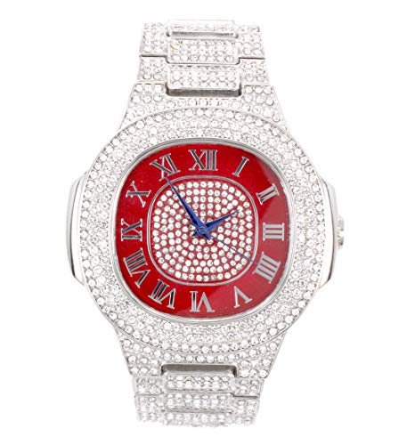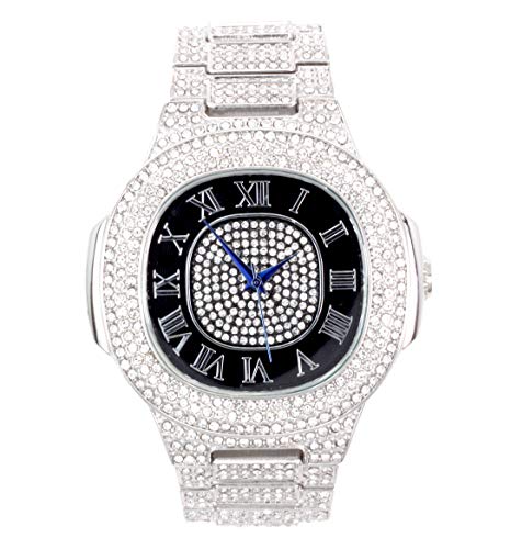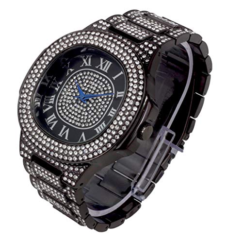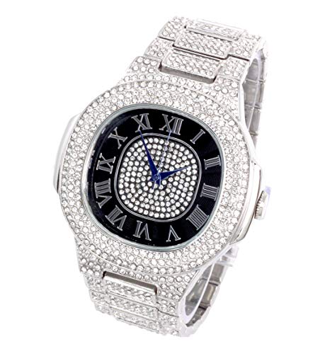 Fully Iced with Shiny Crystal Diamond look Rhinestones on watch trim and band. Center of watch dial has decorative glittered square decor w/ Easy Reader Roman Numerals on Trim.